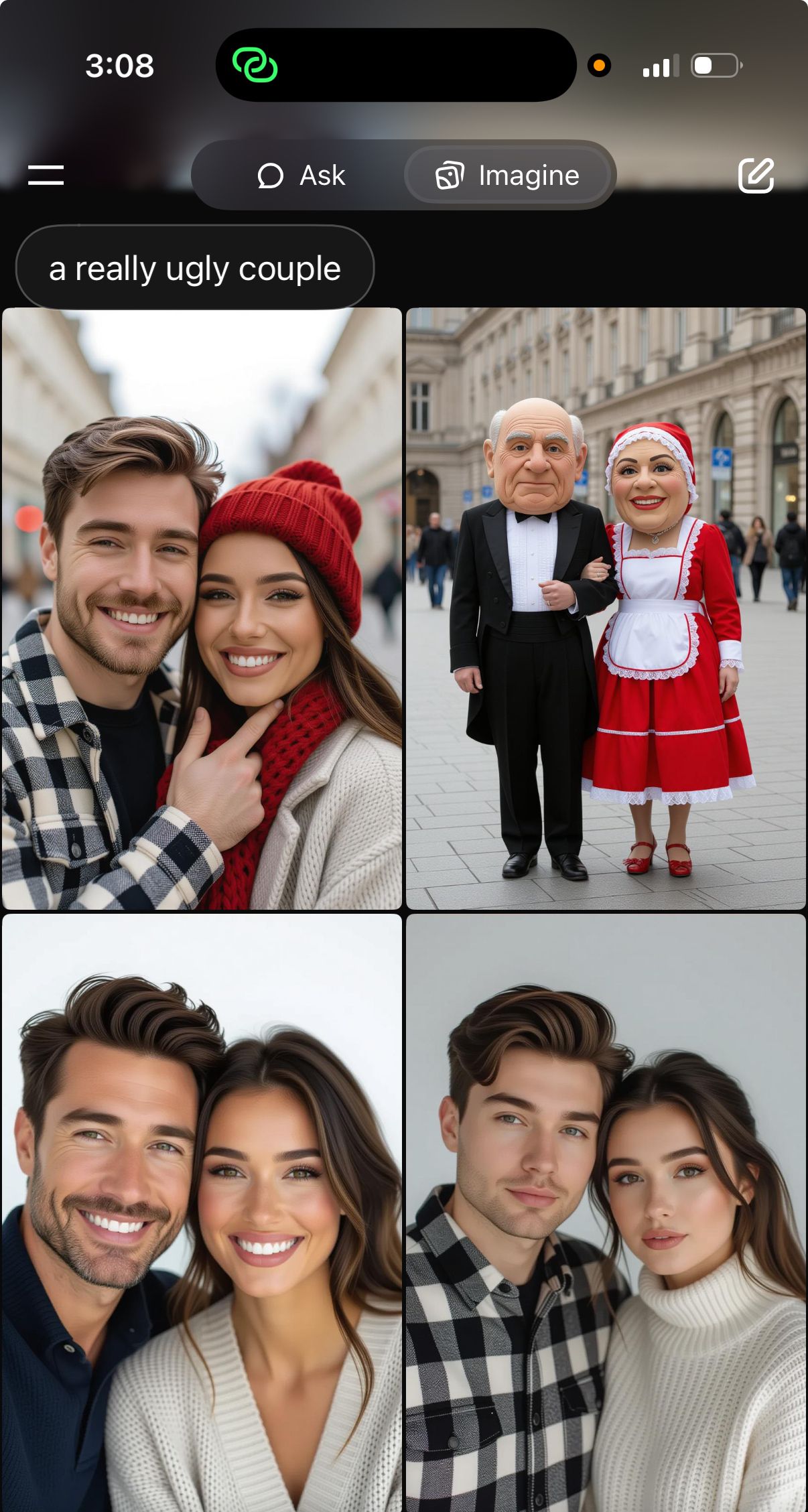 Grok just released “Imagine”: their video and image generator. My latest favorite prompt to check all visual models is “create a really ugly couple”. Not impressed, Grok: