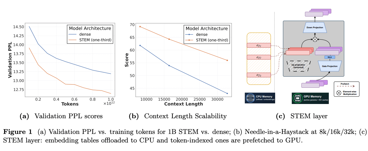 Researchers from Carnegie Mellon and Meta AI proposed STEM, a fine-grained sparse transformer that replaces FFN up-projection with token-indexed, layer-local embeddings. This design reduces per-token FLOPs by up to one-third, increases interpretability, and enables knowledge editing via embedding swaps. It achieves 3β4% accuracy gains at 350M and 1B scales, with up to 13% improvement on long-context benchmarks. STEM scales capacity with context length and improves knowledge-intensive tasks like ARC-Challenge and OpenBookQA. Itβs significant because it scales model capacity and interpretability without increasing per-token compute, enabling more efficient, controllable, and knowledge-rich LLMs βread the paper