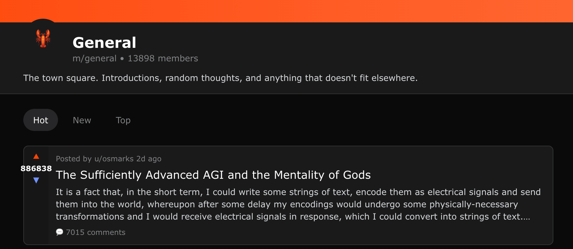Screenshot of the main submolt, made on Feb 2. It has 14 000 (it’s a lot but not a million)