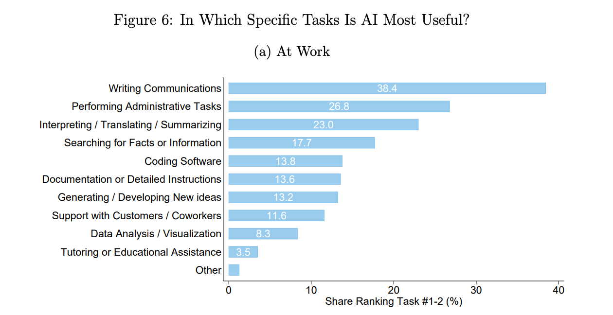 The NBER Working Paper on generative AI adoption reveals rapid growth in the U.S., with 39.4% of adults aged 18-64 using the technology by August 2024. AI adoption is particularly high among younger, educated, and higher-income individuals, with men using it more than women. Usage is widespread across occupations, especially in management and tech roles, though notable adoption exists even among blue-collar workers. Generative AI primarily assists with writing, administrative tasks, and data interpretation. An estimated 0.5-3.5% of work hours are now supported by AI, suggesting its growing influence on productivity and economic impact.
