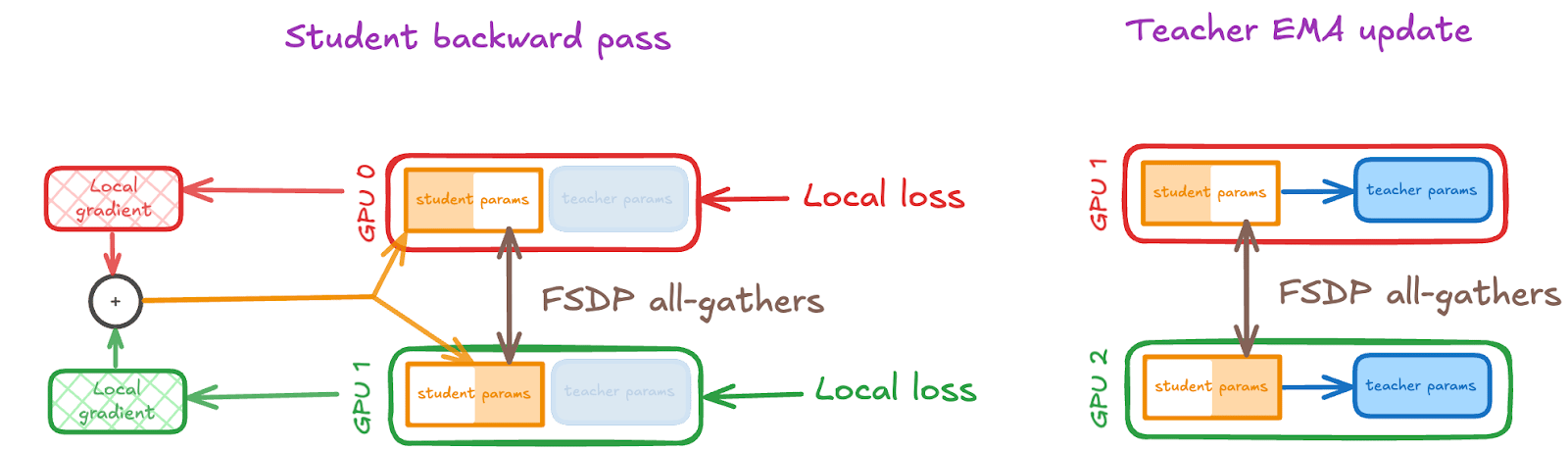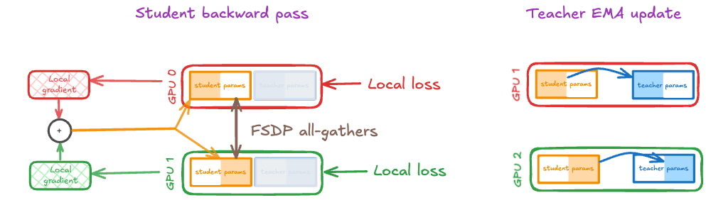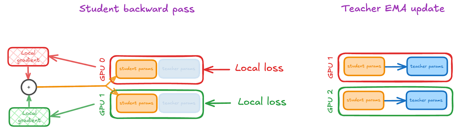 For the student update, one does a local backward pass on the local loss to produce a "local gradient" for each GPU. These local gradients are synchronized across GPUs via an AllReduce operation. The synchronized gradients are then used to update the student network weights across GPUs, so the student parameter update is replicated across GPUs. Once our student update is complete, the teacher EMA update updates all the teacher weights on a given GPU using the updated student weights stored on that GPU.