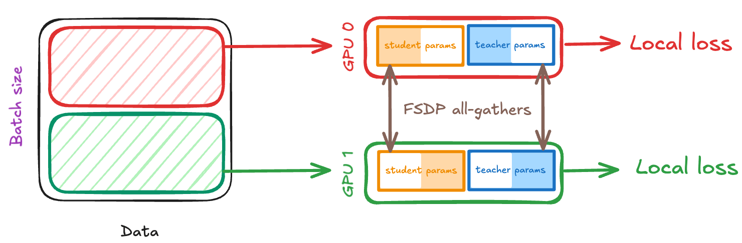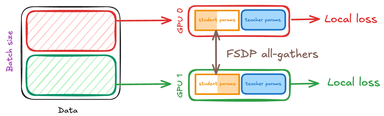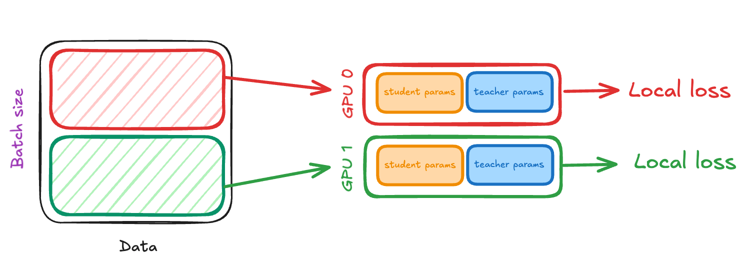 The most straightforward solution is to duplicate both the student and the teacher on every GPU, and train the student using Distributed Data Parallel (DDP). In this setup, each GPU holds a full copy of the student (with gradients and optimizer states) and a full copy of the teacher (updated via EMA of the student on that GPU). Training proceeds as follows:
