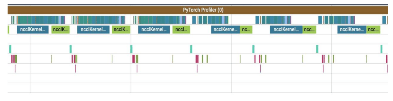 So whatβs happening in the profile? Before the reduce_scatter operation (blue), there are many preparatory computations (small operations under the communications). The small computations run in parallel with the main computation stream, severely slowing down communications. This results in large gaps between communications, and consequently, the same gaps occur in the computation stream.β